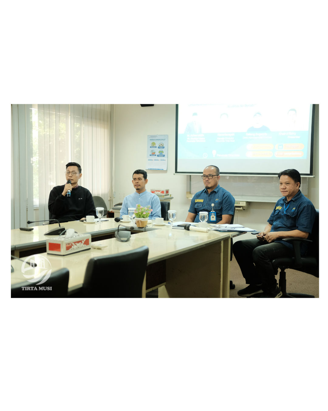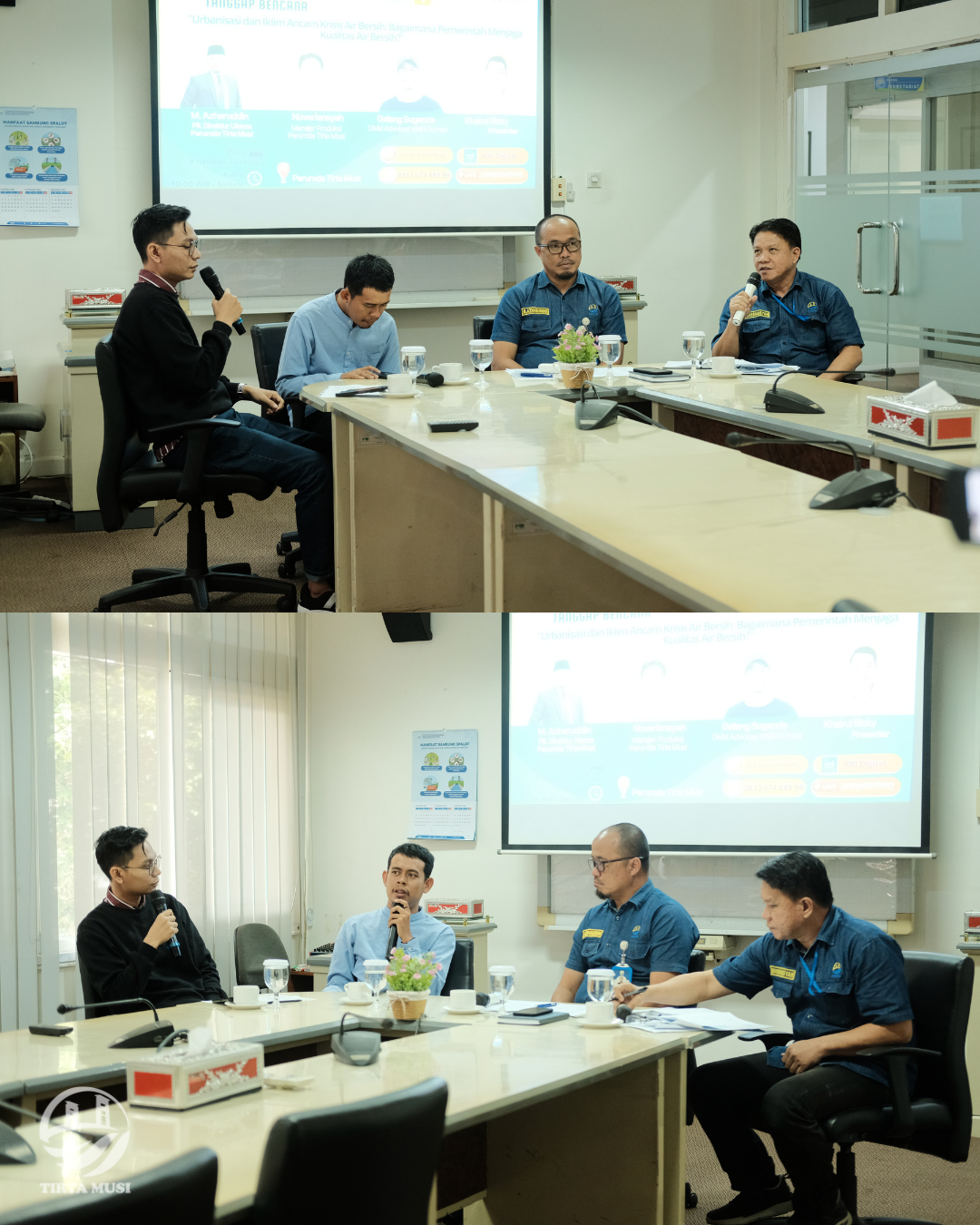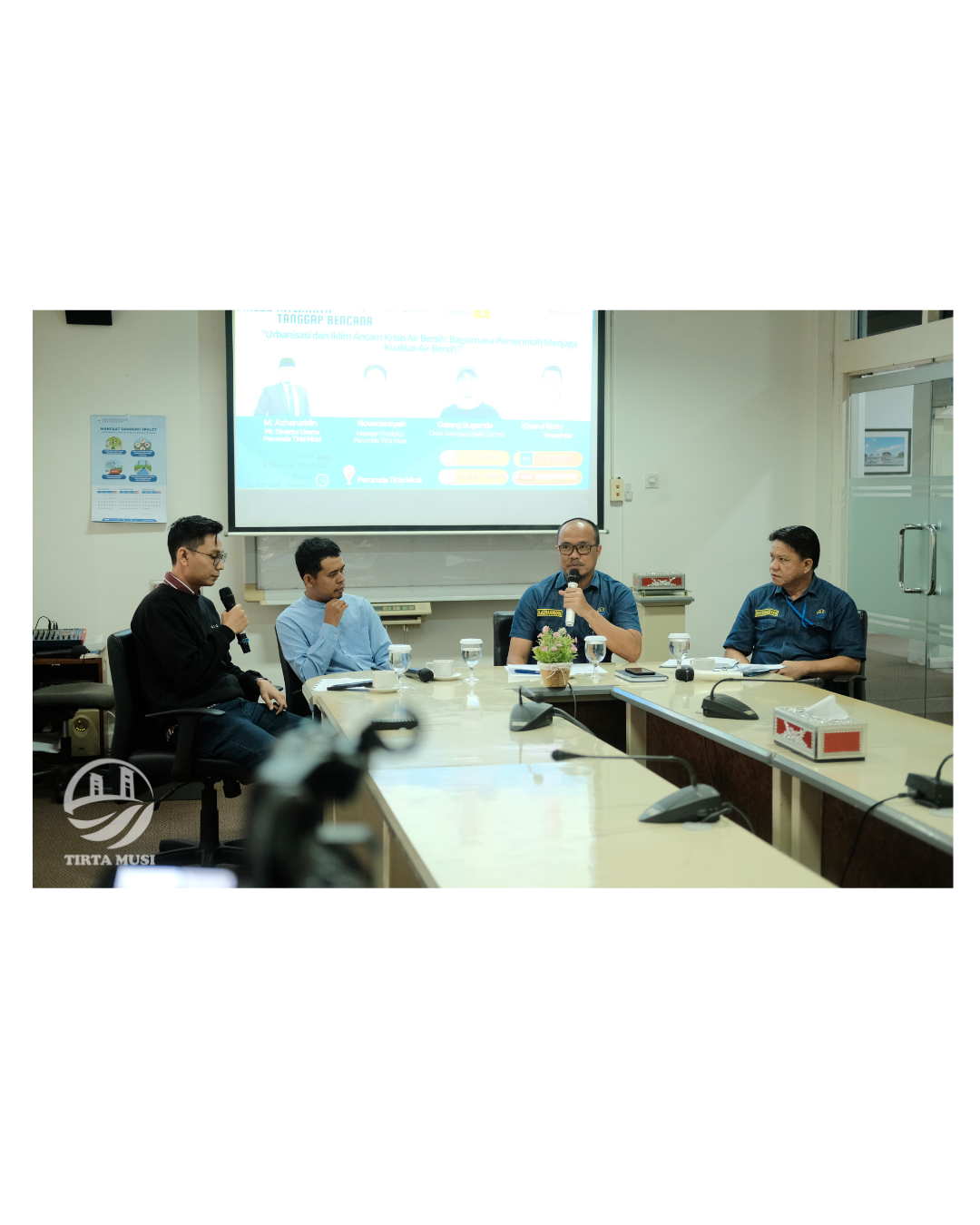 Plt. Direktur Utama Perumda Tirta Musi Palembang, M. Azharuddin, yang didampingi oleh Manajer Produksi, Noveriansyah, sebagai narasumber utama. Turut hadir pula Galang Suganda dari Divisi Advokasi Walhi Sumsel sebagai pembicara pendamping, dengan Khairul Rizky bertindak sebagai moderator dialog.